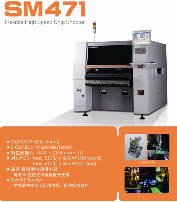三星SM471贴片机是每个贴装头部配有10个轴杆并适用双悬臂,新型飞行相机的高性能贴片机,可实现世界同级产品中的最高速度75000CPH。