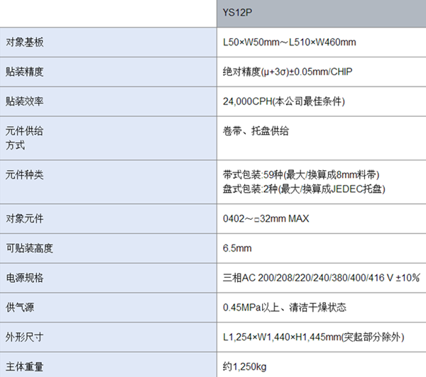 雅马哈YS12P贴片机 小型经济型模块贴片机 24,000CPH (相当于0.15秒 / CHIP)的高速贴装性能 可对应0402~□32mm元件、高度为6.5mm以下的元件 对应大型基板、L尺寸 L510×W460mm 盘式包装元件也对应手动托盘(MT) 内置式割带器 对应CE标记