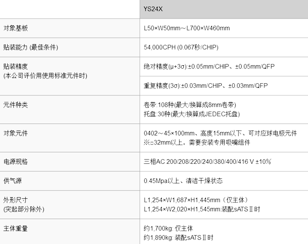 小型高速通用模块贴片机 54,000CPH(0.067 秒/CHIP)通用贴片机最佳的贴装能力 sATSⅡ自动交换式托盘 对应供给装置 L700×W460mm 对应超大型基板 对应雅马哈双搬运轨道系统 0402~45×100mm 对应元件 H15mm 对应高度
