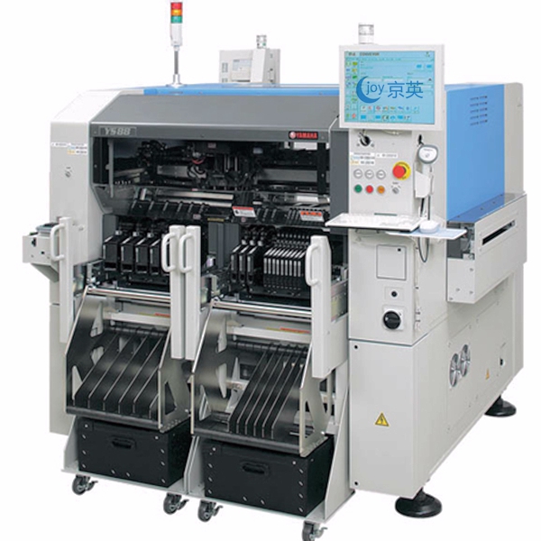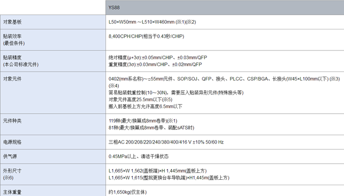 雅马哈YS88贴片机 多功能异型模块贴片机 可对应0402 芯片~□55mm元件、长接头的广范围异形元件 对象元件的高度可对应25.5mm 可进行10~30N的简易贴装载重控制 全部时间,QFP贴装绝对精度±30μm、QFP贴装反复精度±20μm 可对应多功能异形要求、 具有8,400CPH(相当于0.43秒/CHIP:最佳条件)的贴装能力 对应L尺寸基板 (L510×W460mm)